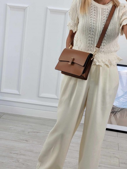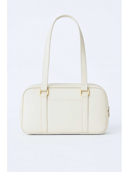 Ta torebka to idealny przykład tego, jak połączyć ponadczasową formę z nowoczesnym wykończeniem. Utrzymana w śmietankowym odcieniu beżu, zachwyca wykończeniem i prostą, geometryczną sylwetką. Jej wydłużony, prostokątny kształt i miękkie zaokrąglenia nadają jej subtelny, ale zdecydowany charakter. Całość dopełniają skórzane paski z drobnymi, złotymi detalami — czyli klasyka w nowoczesnym wydaniu.