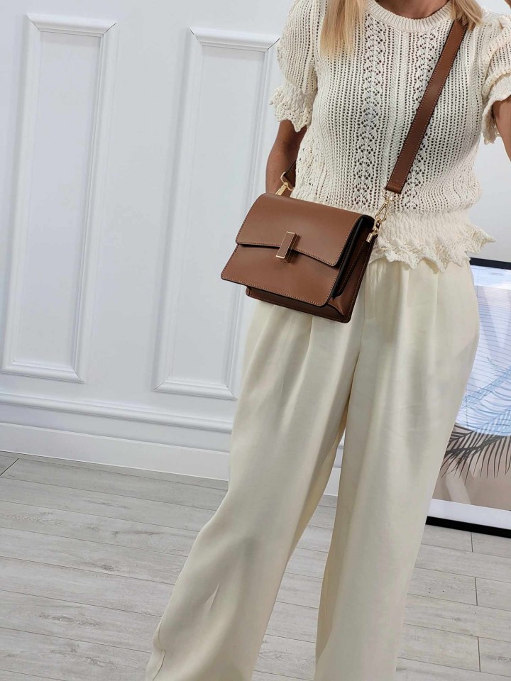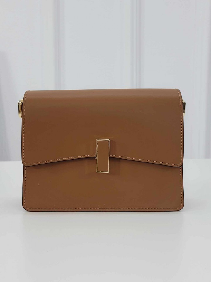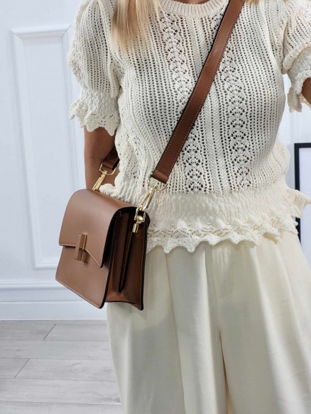Torebka Tracy to doskonała propozycja dla kobiet lubiących praktyczne, ale również proste rozwiązania. Model z odpinanym paskiem. Posiada zapięcie na bigiel, natomiast komora jest otwarta. Wewnątrz dodatkowa kieszonka na suwak. Torebka z modnym akcentem zdecydowanie wyróżnia wśród innych. Z przodu biżuteryjne zapięcie, które nadaje całości oryginalnego wyglądu. Torebka dostępna jest w wielu wariantach kolorystycznych. Wykonana ze skóry naturalnej wysokiej jakości. Projekt włoskiej marki klasy premium. Torebka w camelowym odcieniu brązu.