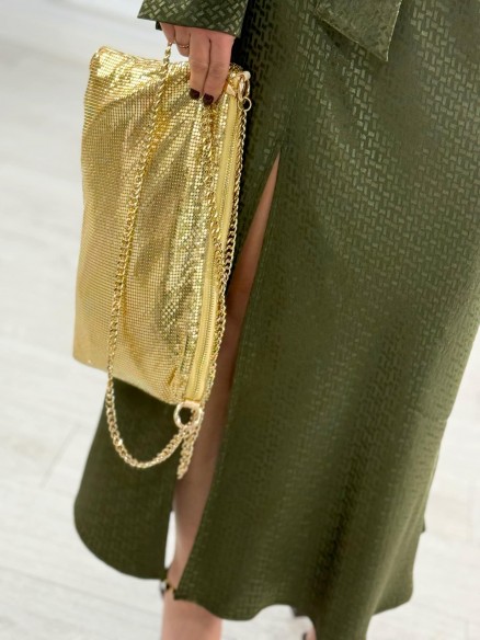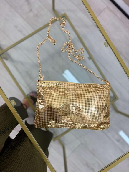 Torebka Kim to elegancka kopertówka z błyszczącego materiału. Prostokątny, wiotki fason. Do torebki dołączony jest łańcuszek. Zapinana na zamek. Doda szyku każdej eleganckiej stylizacji! Idealna jako dodatek na imprezowe wyjście. Zmieści wszystkie niezbędne drobiazgi.