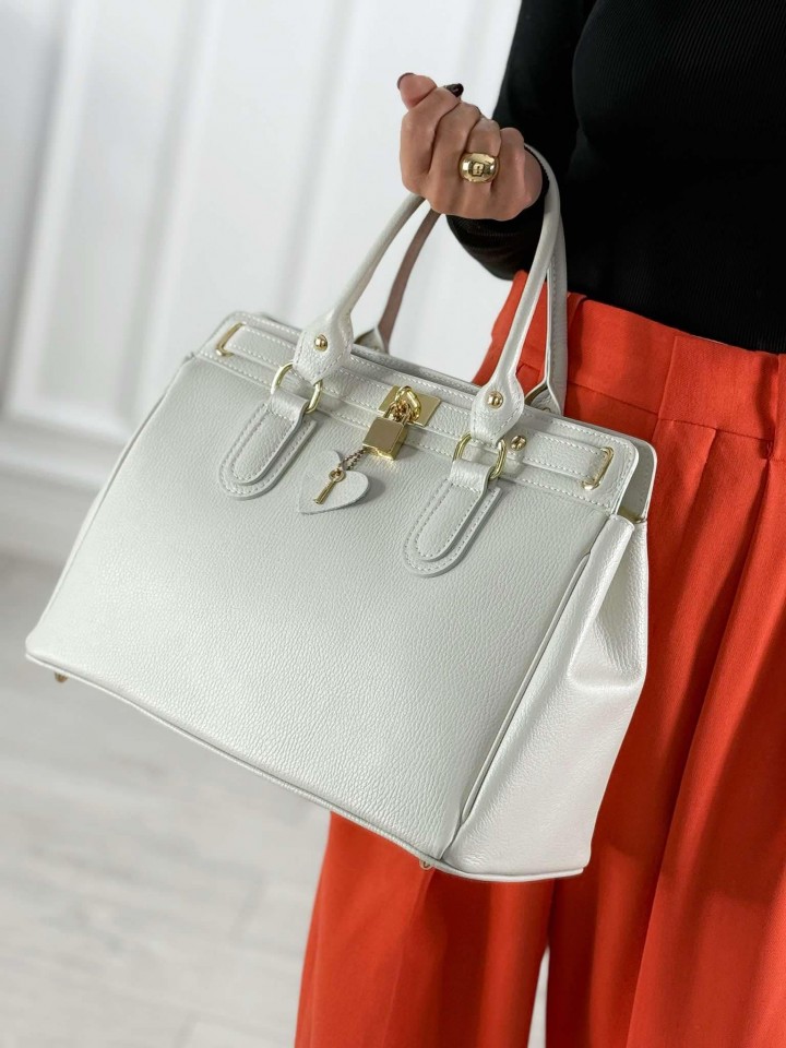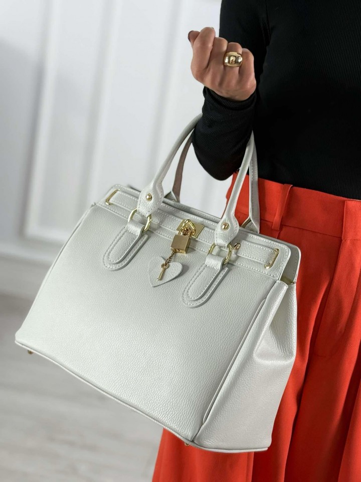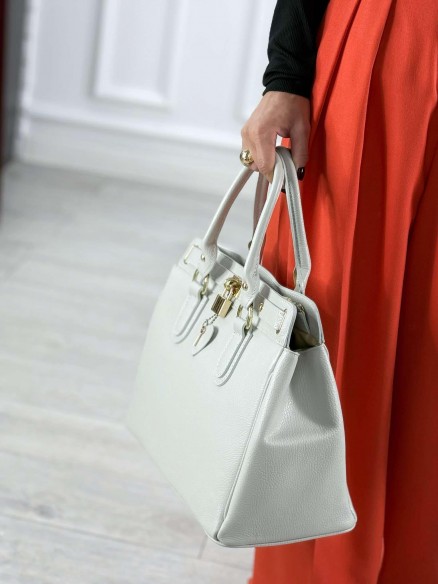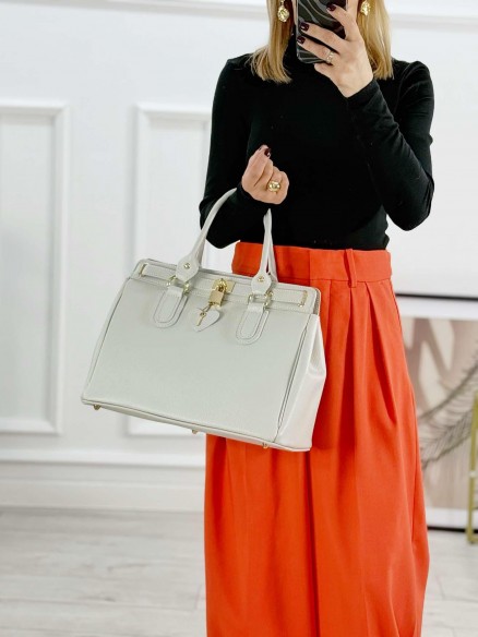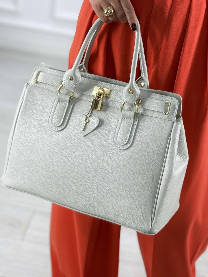 Elegancka, stylowa, zgrabna toreba z włoskiej skóry naturalnej. To model, który nada twoim stylizacjom szyku. Wygląda niezwykle oryginalnie. Torebka klasy premium, wykonana z dbałością o detale, z wysokiej jakości materiałów. Okucia torebki w kolorze złotym. Klasyczny fason zapewnia jej ponadczasowość. Będzie idealnym elementem każdej szafy kapsułowej. To model, który pozostanie z Tobą na wiele lat. Zawsze warto mieć klasyka w swoim zestawie. Jest nie tylko piękna ale i praktyczna. Pomieści wszystkie potrzebne rzeczy. W środku kieszonka na zamek oraz oearta. Torebka w kolorze bardzo jasnej szarości. Dostępa w kilku wariantach kolorystycznych.