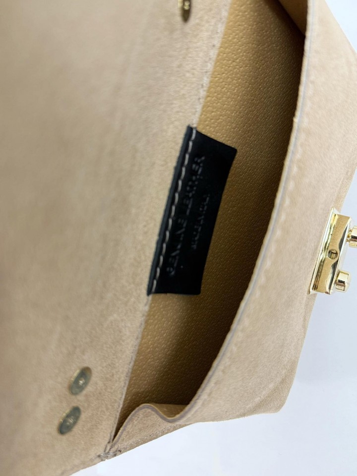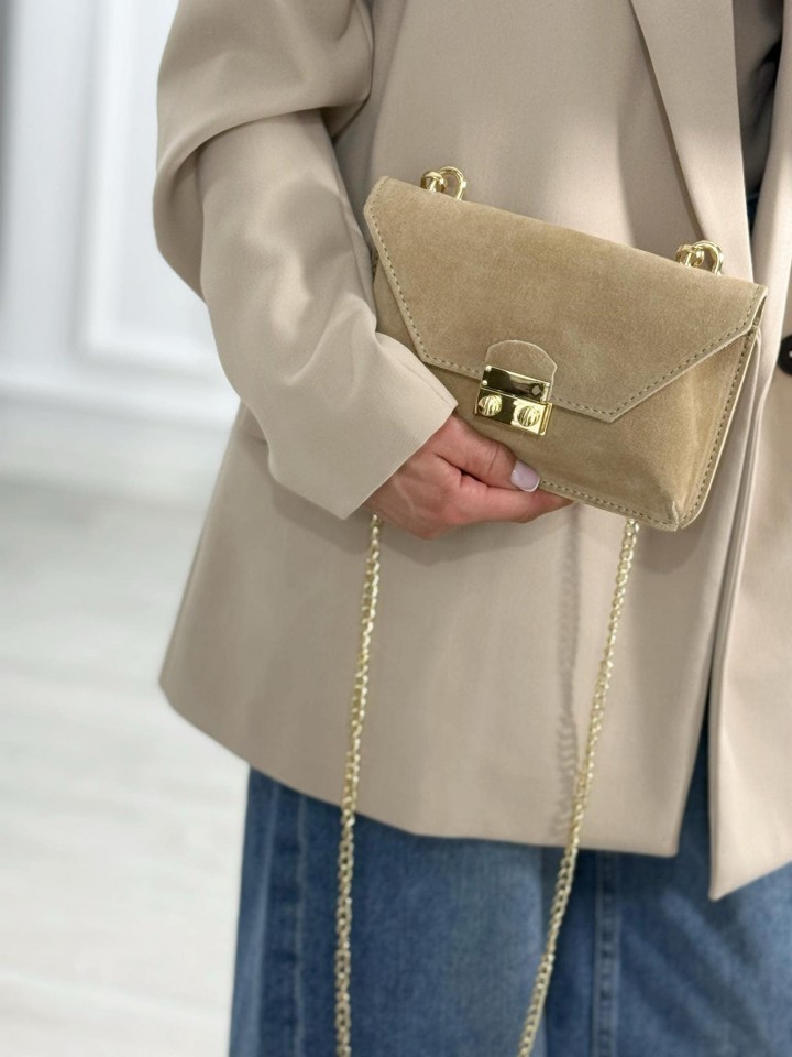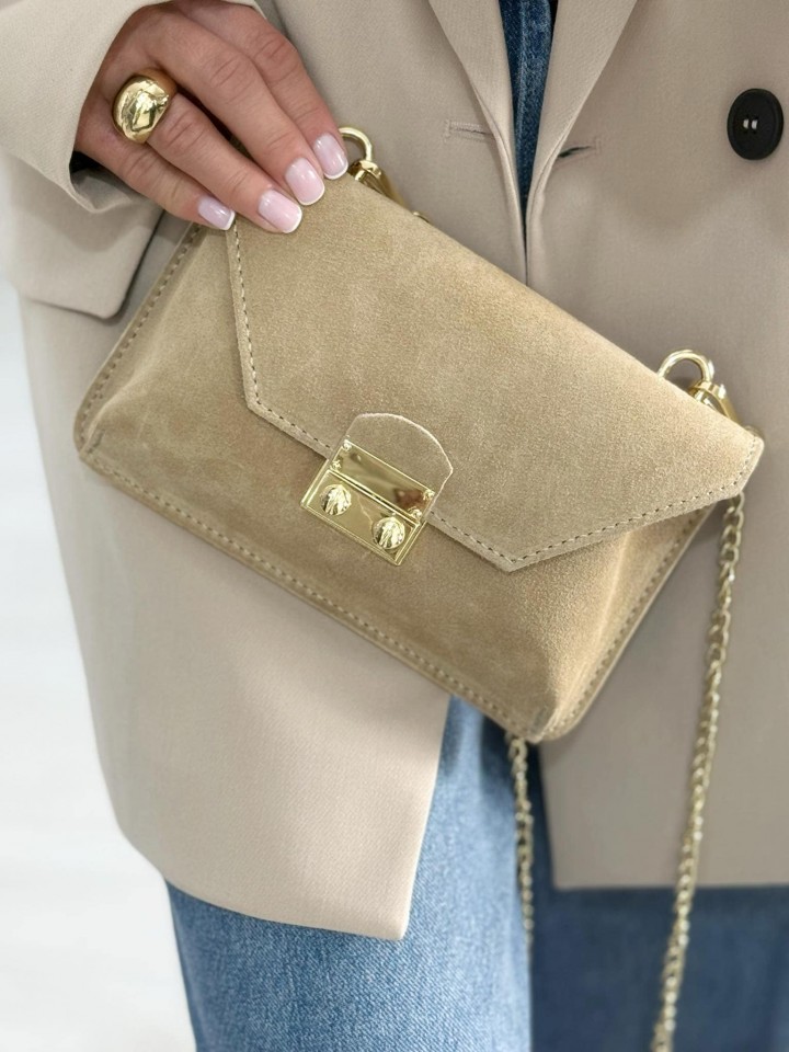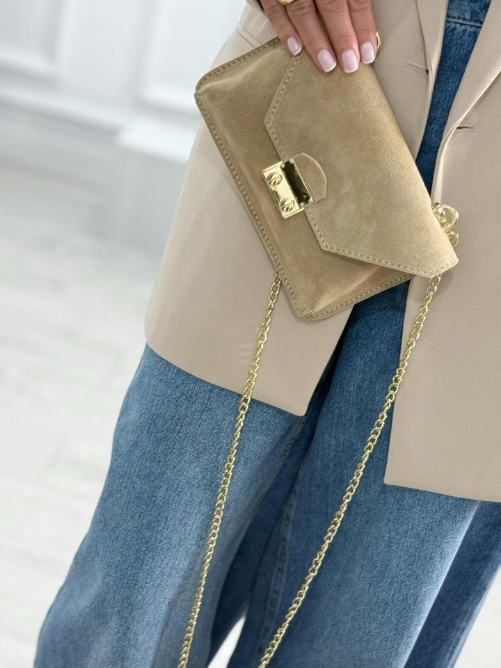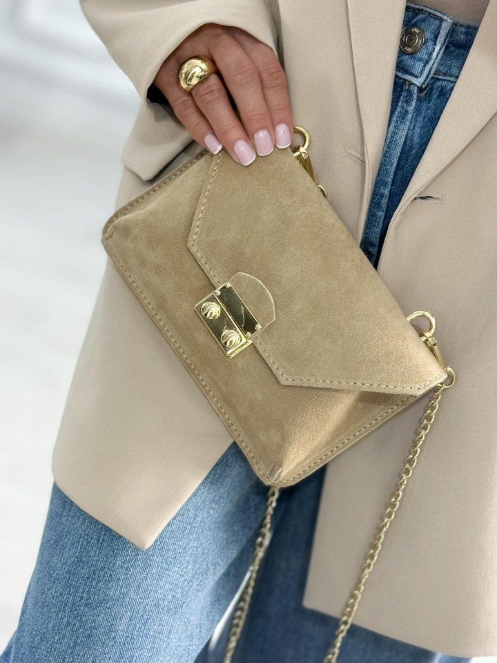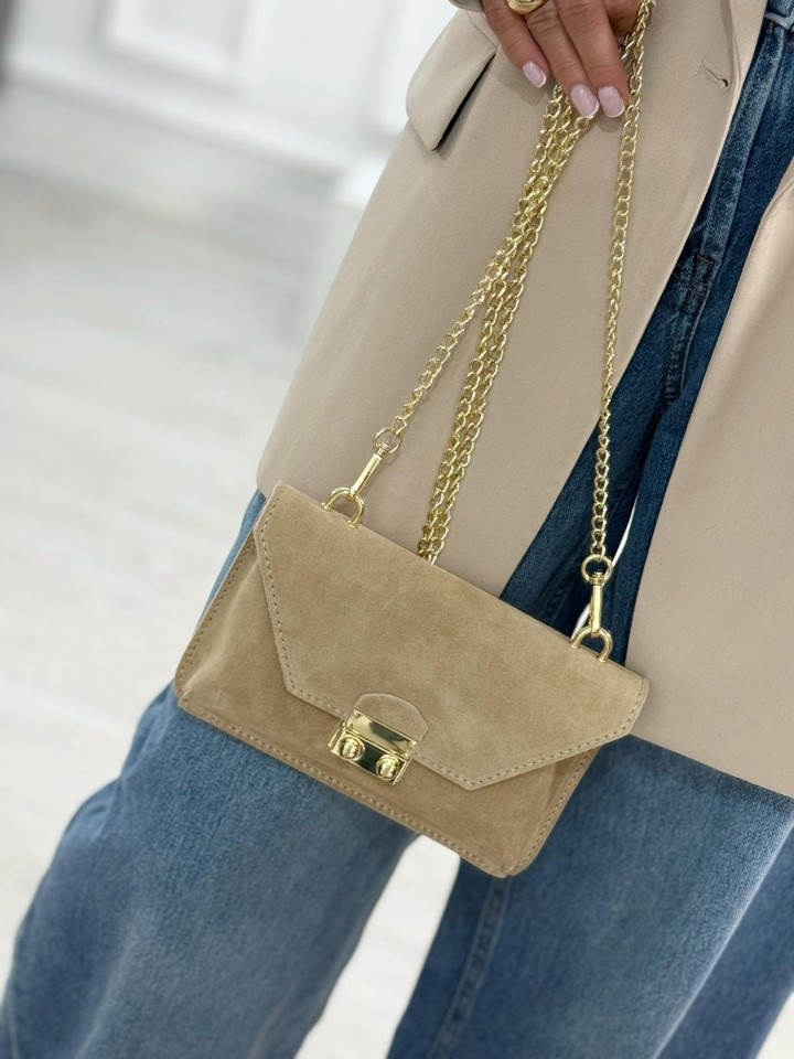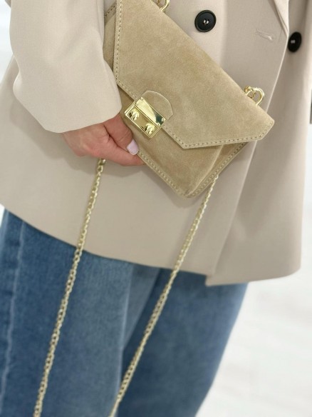Torebka o prostokątnym kształcie wykonana z włoskiej skóry naturalnej zamszowej to idealny dodatek do uzupełnienia codziennych i eleganckich looków. Produkt zapinany na zatrzask. Posiada pasek w formie łańcuszka. Wewnątrze surowo wykończone. Dostępna w wielu wariantach kolorystycznych. utaj model w kolorze jasnego beżu.