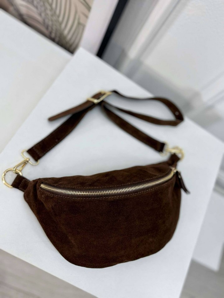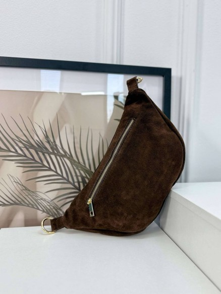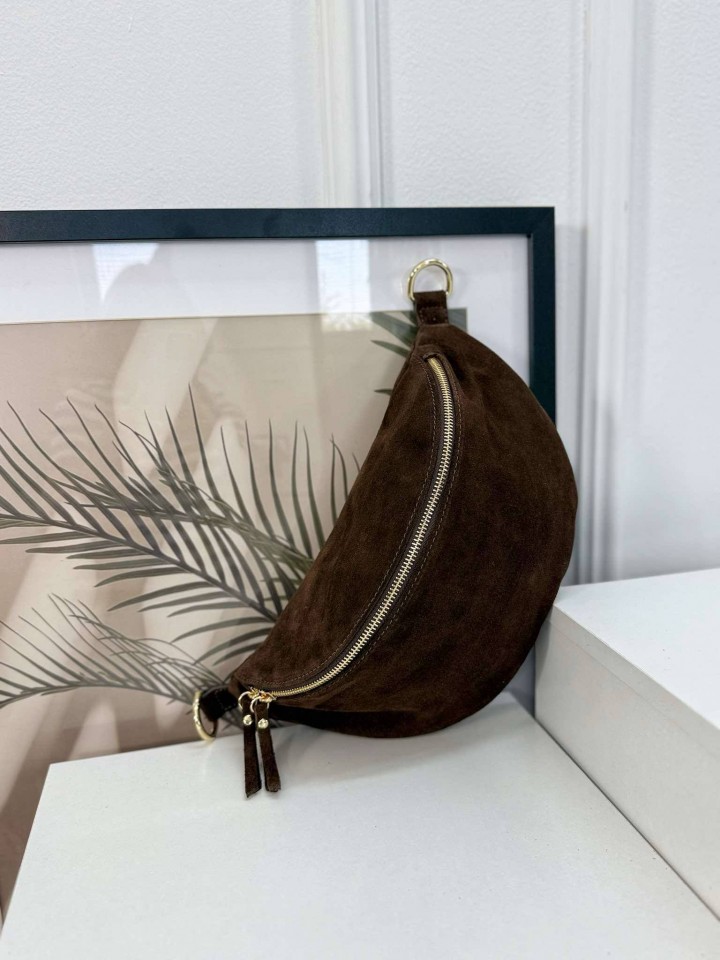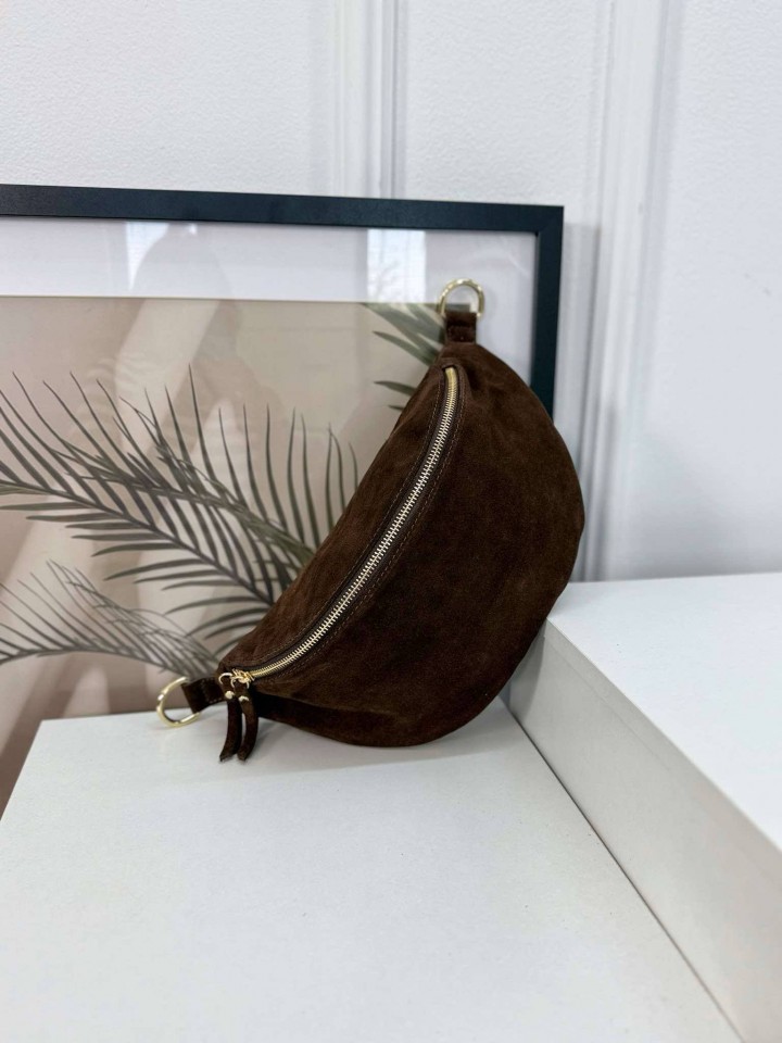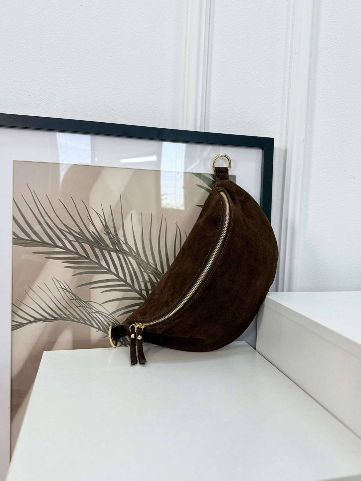 Torebka nerka crossbody wykonana ze skóry naturalnej zamszowej w kolorze czekoladowego brazu. Wnętrze zapinane na suwak. W środku jedna komora, z kieszonką. Torebka nerka ma skórzany, regulowany pasek. Ten projekt świetnie sprawdzi się do wielu codziennych stylizacji. Średniej wielkości torebka nerka pomieści wszystkie niezbędne drobiazgi. Bardzo dobrze wykonana, z dbałością o detale. W środku czarna podszewka. Projekt włoskiej marki. Torebka klasy Premium.
