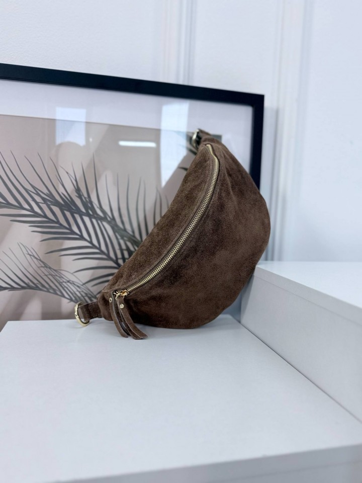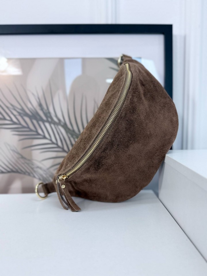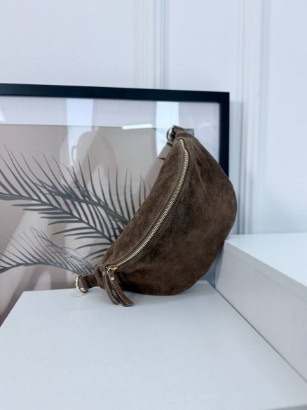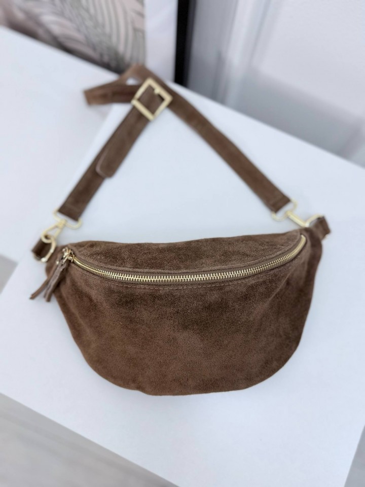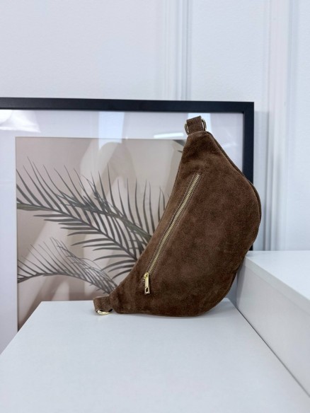 Torebka nerka crossbody wykonana ze skóry naturalnej zamszowej w kolorze mocca. Wnętrze zapinane na suwak. W środku jedna komora, z kieszonką. Torebka nerka ma skórzany, regulowany pasek. Ten projekt świetnie sprawdzi się do wielu codziennych stylizacji. Średniej wielkości torebka nerka pomieści wszystkie niezbędne drobiazgi. Bardzo dobrze wykonana, z dbałością o detale. W środku czarna podszewka. Projekt włoskiej marki. Torebka klasy Premium.