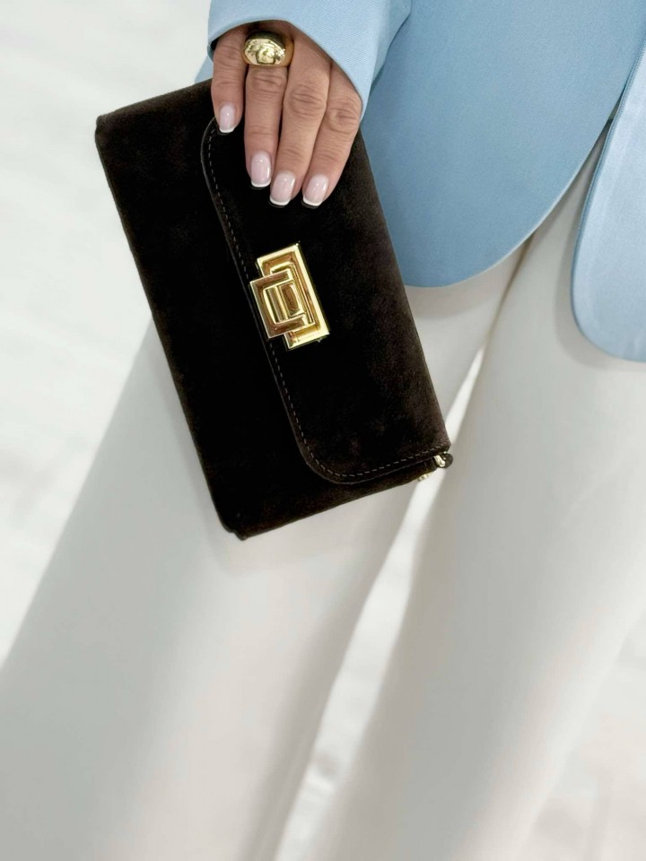 Torebka Holi w brązowej wersji z zamszowej skóry naturalnej to idealny wybór dla miłośniczek klasyki z nowoczesnym twistem. Jej prostokątny kształt oraz minimalistyczny fason sprawiają, że świetnie odnajdzie się zarówno w codziennych, jak i bardziej eleganckich stylizacjach. Charakterystyczne zapięcie nadaje jej wyjątkowego wyglądu. Możesz założyć ją jako kopertówkę na przyjęcie albo listonoszkę na codzienne wyjścia.
