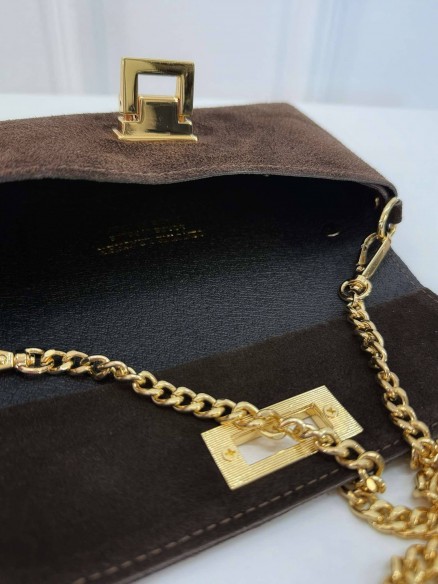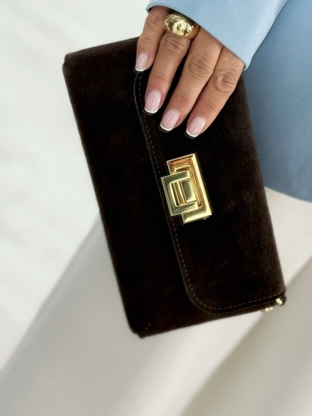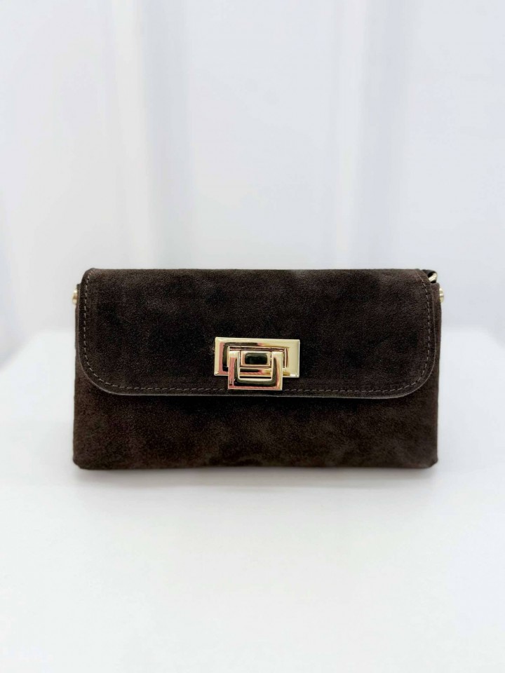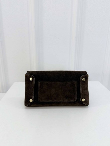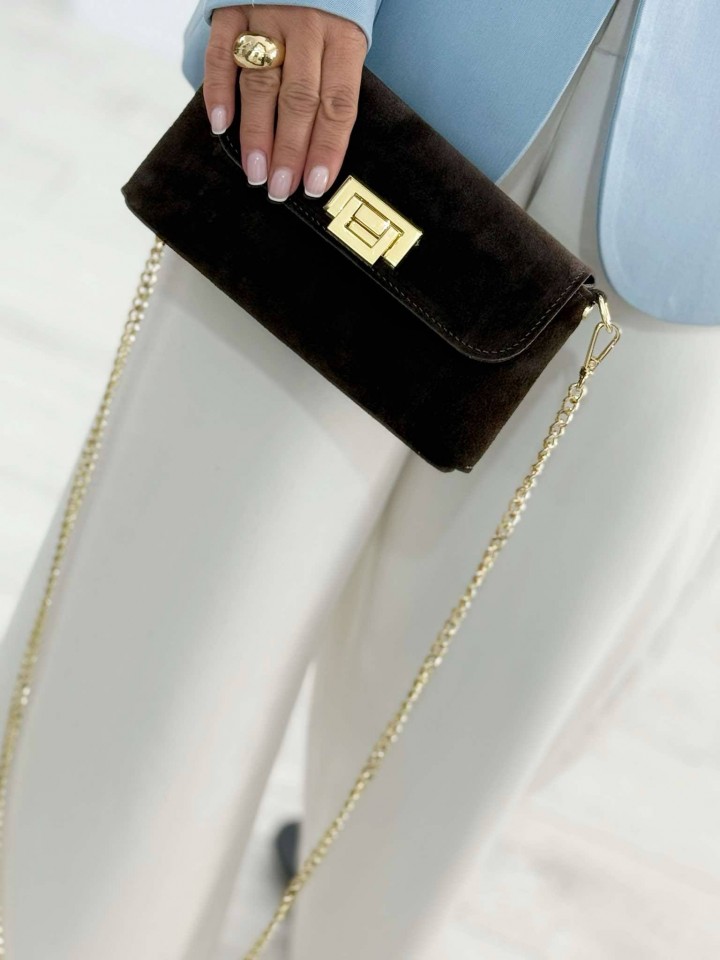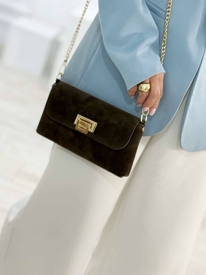 Wnętrze torebki zostało wyposażone w praktyczną kieszonkę na zamek, która pomieści najważniejsze drobiazgi. Dodatkowy, długi pasek na ramię zwiększa komfort użytkowania – możesz nosić ją tak, jak lubisz. Matowe wykończenie z naturalnego zamszu w odcieniu  czekoladowgo brązu dodaje całości szlachetności i ponadczasowego szyku.