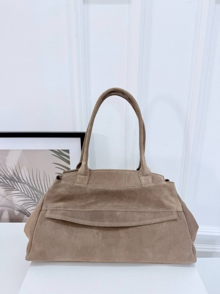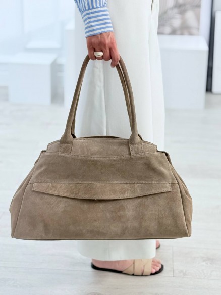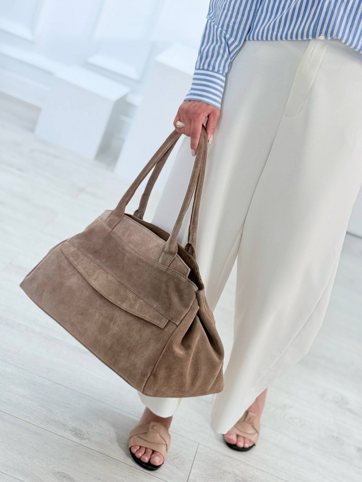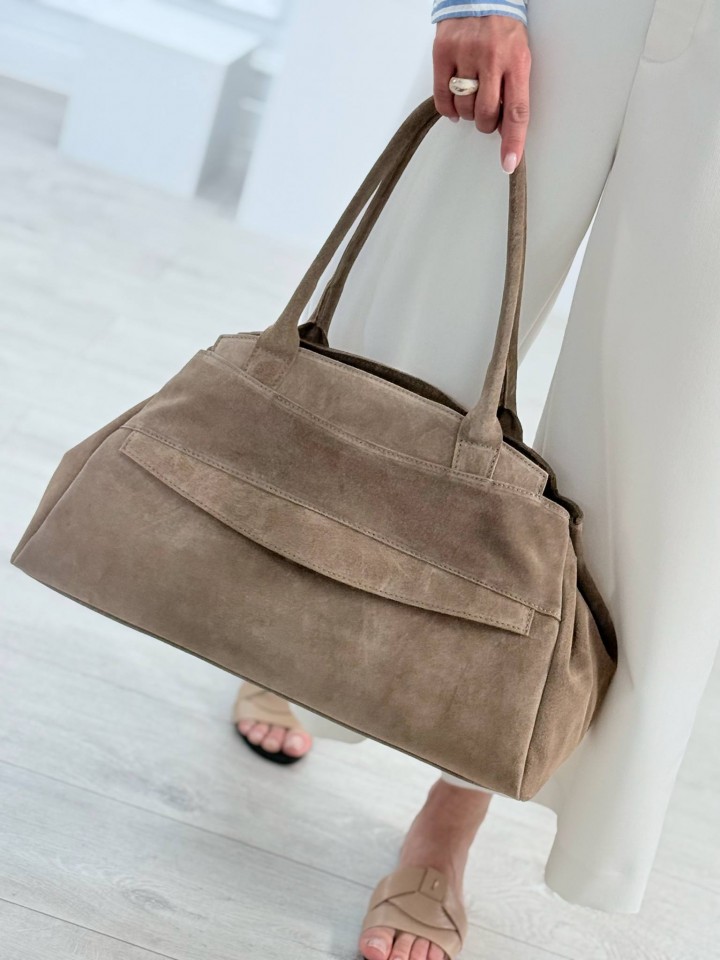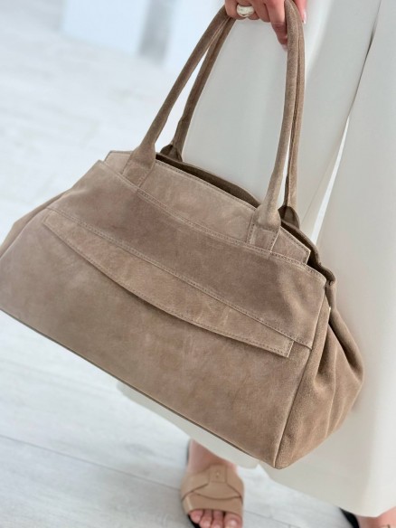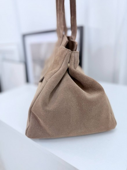 Torebka Iriss to połączenie elegancji i funkcjonalności. Wykonana w 100% ze skóry naturalnej zamszowej, oferuje przestronną komorę oraz liczne kieszonki, które pomogą w organizacji drobiazgów. Z przodui z tyłu torebki znajduje się ozdobna kieszonka zapinana na zamek, która dodaje jej charakteru. Złote zdobienia nadają całości wyjątkowego blasku.Toreba ma rozpinane boki.