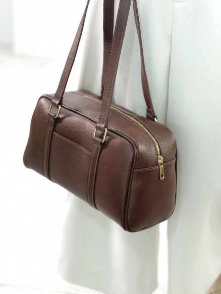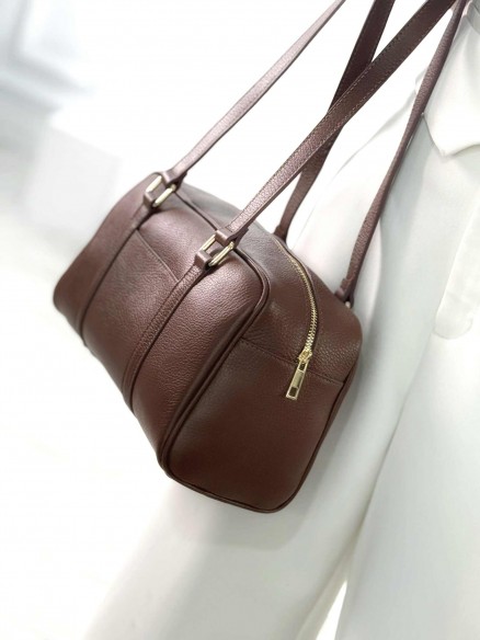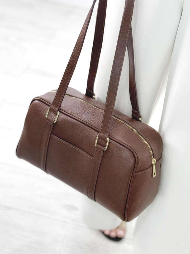 Ta torebka to idealny przykład tego, jak połączyć ponadczasową formę z nowoczesnym wykończeniem. Utrzymana w brązowym odcieniu, zachwyca wykończeniem i prostą, geometryczną sylwetką. Jej wydłużony, prostokątny kształt i miękkie zaokrąglenia nadają jej subtelny, ale zdecydowany charakter. Całość dopełniają skórzane paski z drobnymi, złotymi detalami — czyli klasyka w nowoczesnym wydaniu.