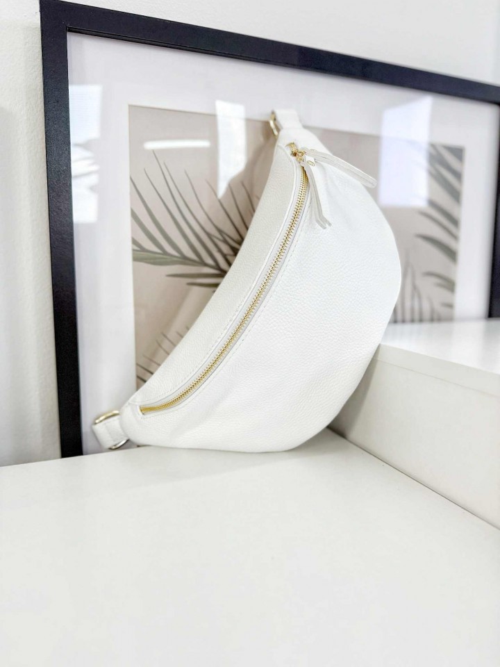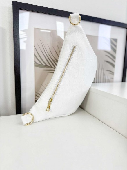 Złoty suwak wzdłuż górnej krawędzi dodaje jej wyrafinowanego akcentu, kontrastując z matową fakturą skóry. Ergonomiczny kształt nerki sprawia, że idealnie dopasowuje się do sylwetki – można ją nosić zarówno na biodrach, jak i przewieszoną przez ramię.