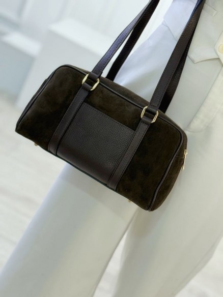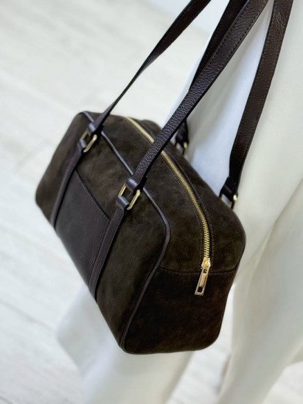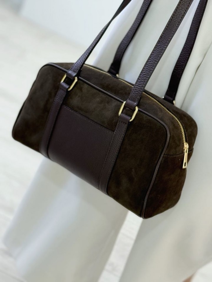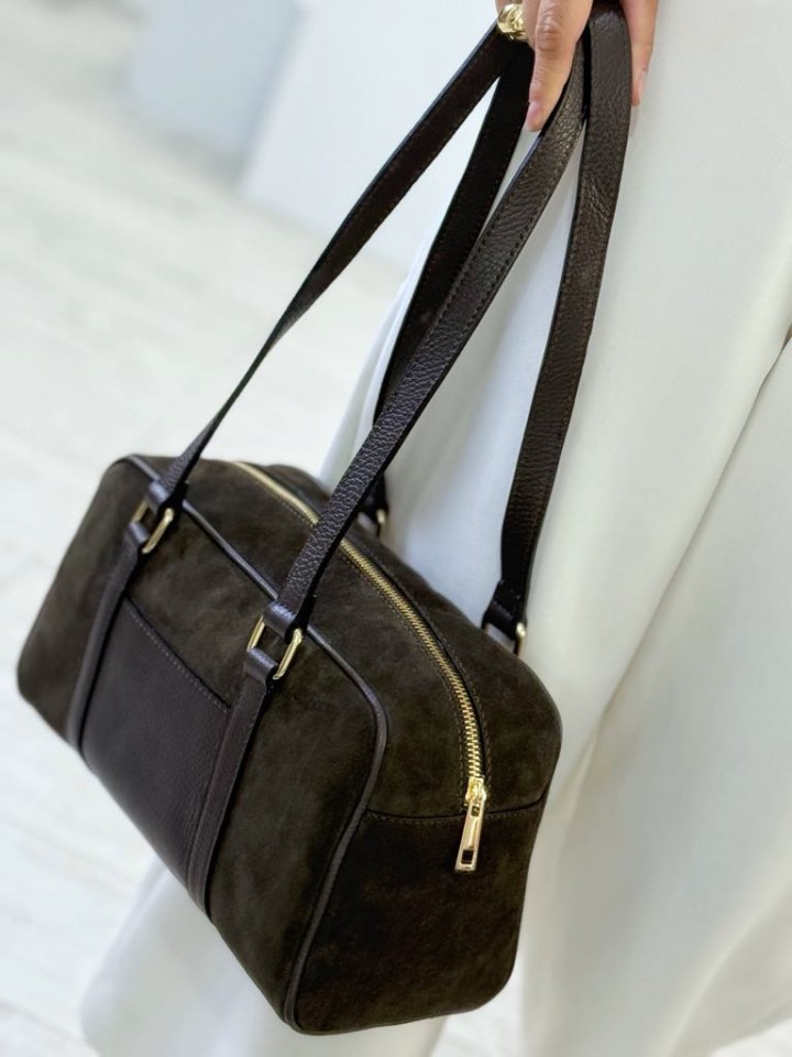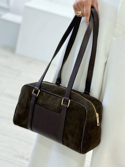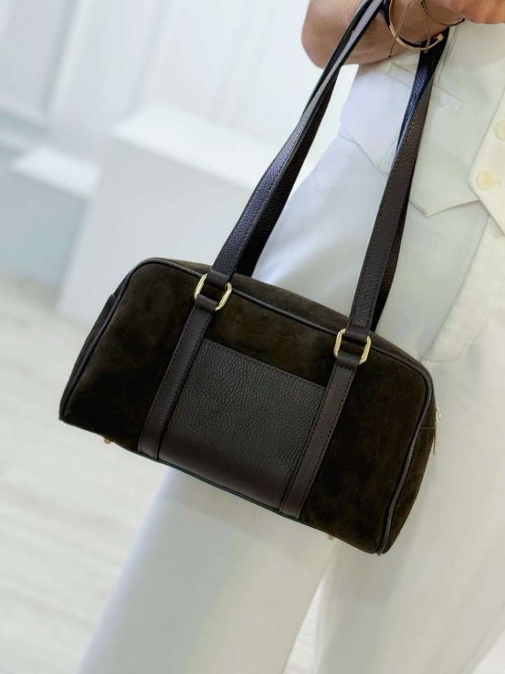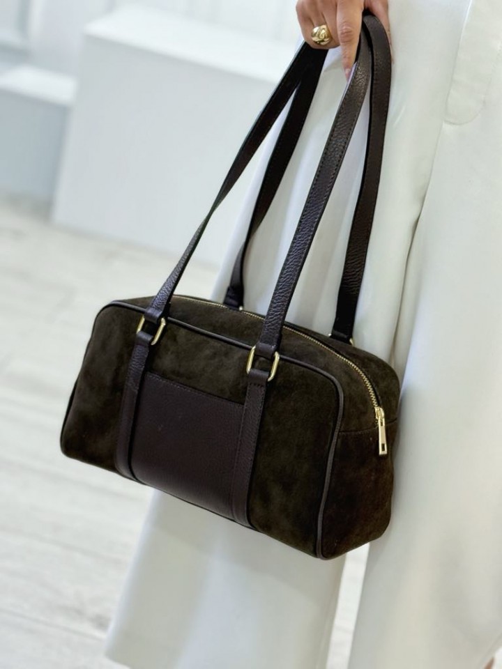 Ta torebka to idealny przykład tego, jak połączyć ponadczasową formę z nowoczesnym wykończeniem. Utrzymana w głębokim odcieniu czekoladowego brązu, zachwyca zamszowym wykończeniem i prostą, geometryczną sylwetką. Jej wydłużony, prostokątny kształt i miękkie zaokrąglenia nadają jej subtelny, ale zdecydowany charakter. Całość dopełniają skórzane paski z drobnymi, złotymi detalami — czyli klasyka w nowoczesnym wydaniu.