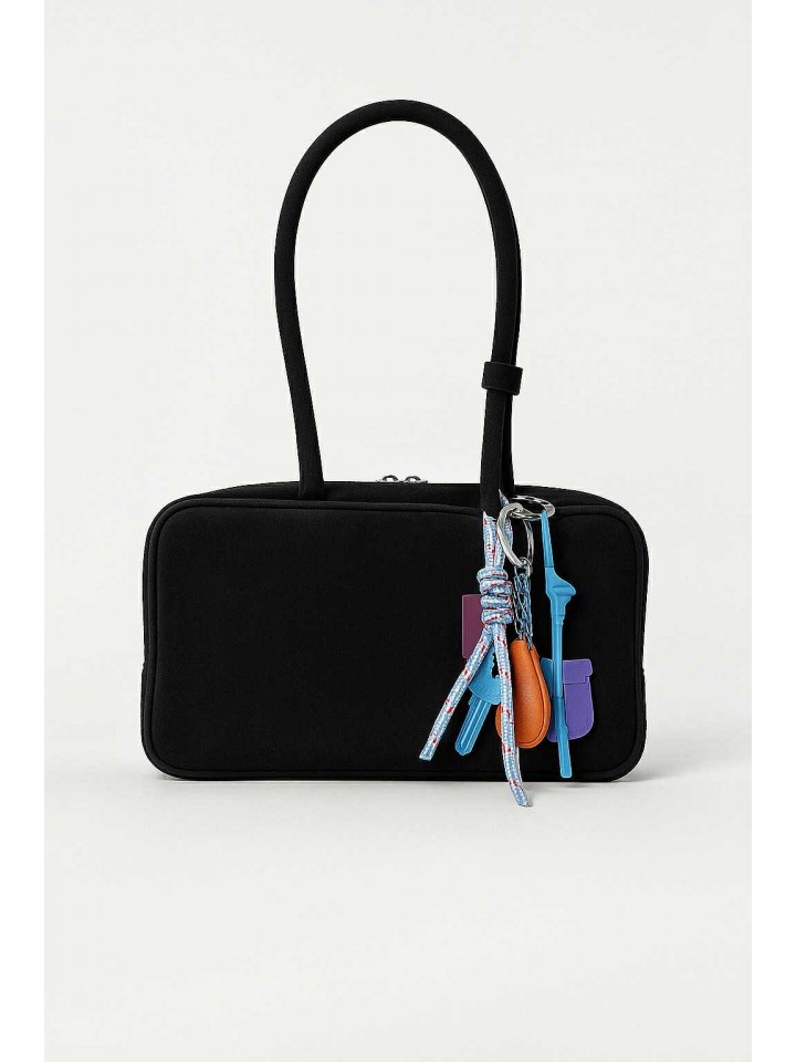 Poczuj siłę detalu. Ta czarna torebka wykonana z najwyższej jakości włoskiego zamszu to coś więcej niż dodatek — to manifest stylu. Jej miękka, przyjemna w dotyku struktura subtelnie kontrastuje z wyrazistymi akcentami w postaci kolorowych breloków, które przyciągają spojrzenia i podkreślają Twoją unikalność.