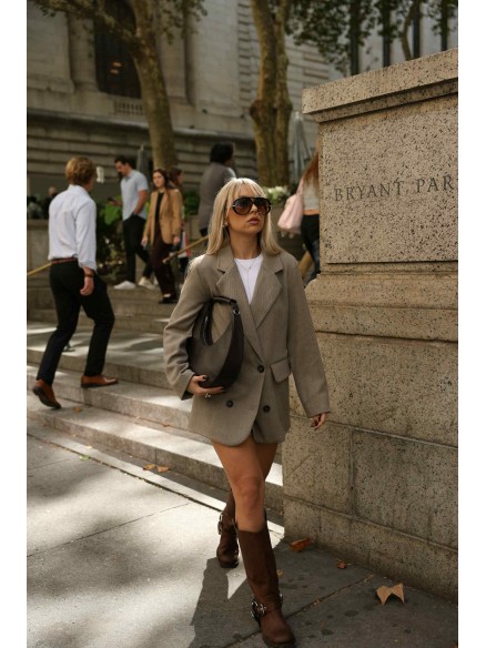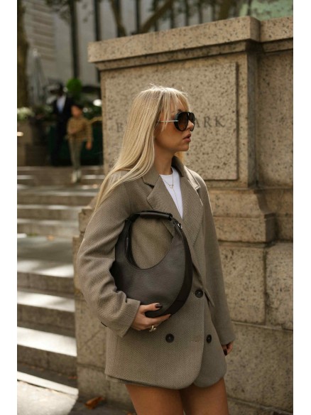 Stylowy garnitur w neutralnych kolorach, a po pracy zamień buty na trampki i gotowe – jedna torebka, dwa nastroje.