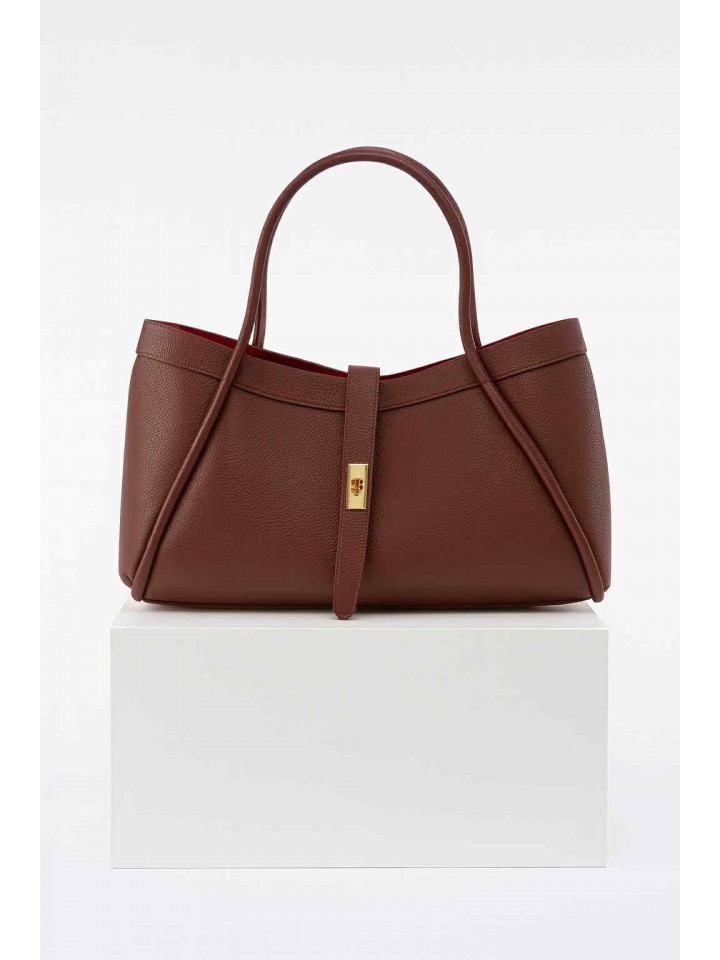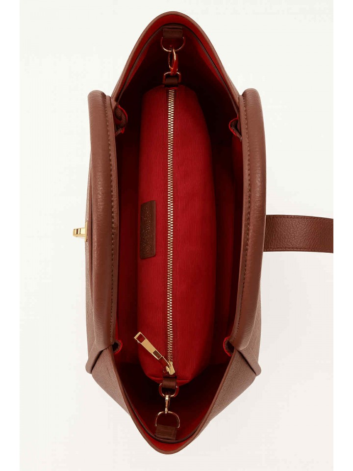 Samanta w kolorze brązu to elegancka i praktyczna torebka, która idealnie dopełni każdą stylizację. Wykonana z miękkiej, wysokogatunkowej skóry naturalnej, zachwyca minimalistyczną formą i subtelną kolorystyką. Wnętrze torebki wykończone kontrastującą czerwienią dodaje jej unikalnego charakteru, a dołączona kosmetyczka w tym samym kolorze pozwala utrzymać porządek w środku. Złote detale dopełniają całość, nadając torebce szykownego wyglądu. A długi, regulowany pasek pozwoli swobodnie zawiesić ją na ramieniu.