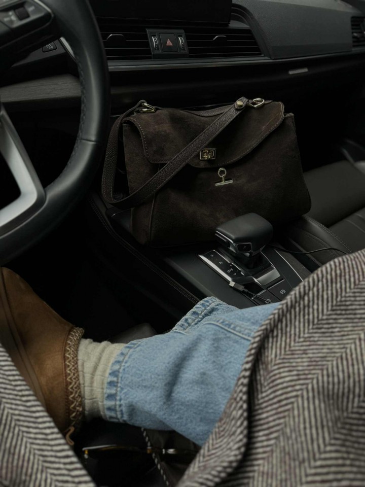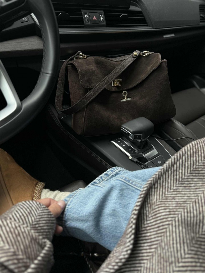 Miękka skóra zamszowa, minimalistyczna forma i detal, który robi robotę. Ta torebka łączy luz z klasą – pasuje do oversize’owej marynarki, jeansów i codziennego biegu między spotkaniami.