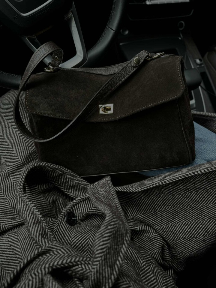 Miękka skóra zamszowa, minimalistyczna forma i detal, który robi robotę. Ta torebka łączy luz z klasą – pasuje do oversize’owej marynarki, jeansów i codziennego biegu między spotkaniami.
