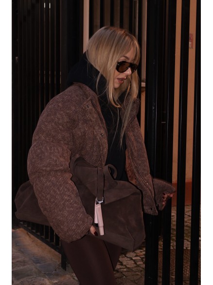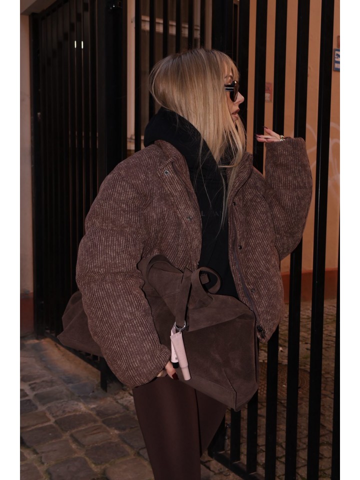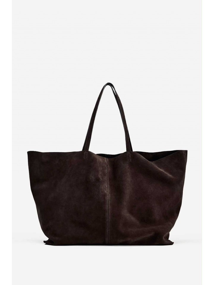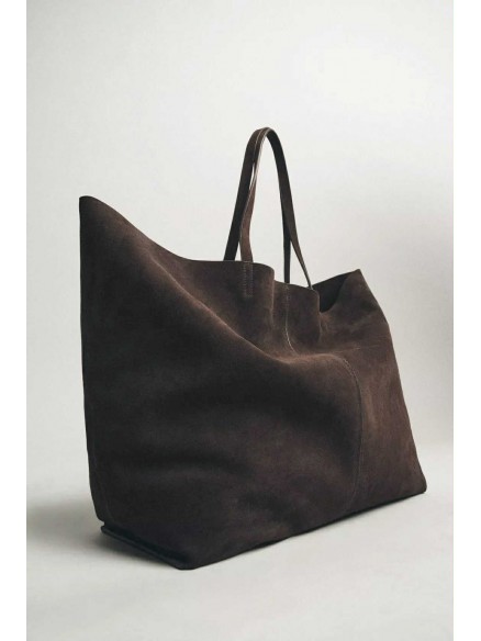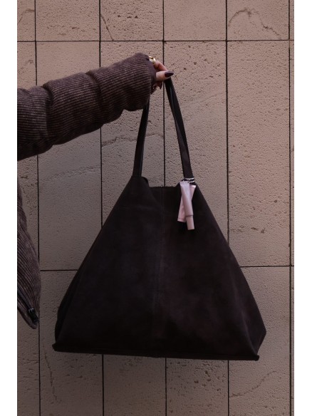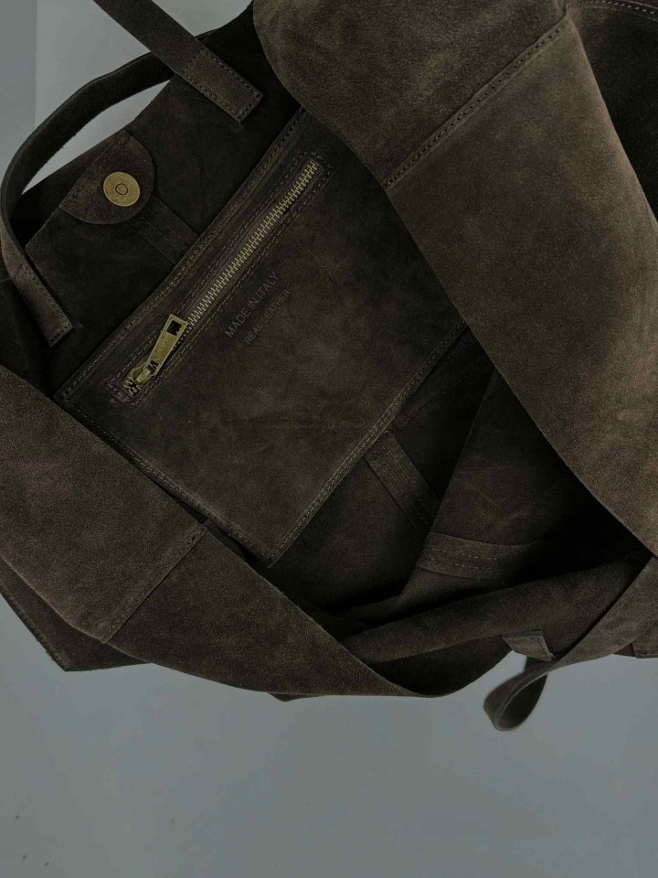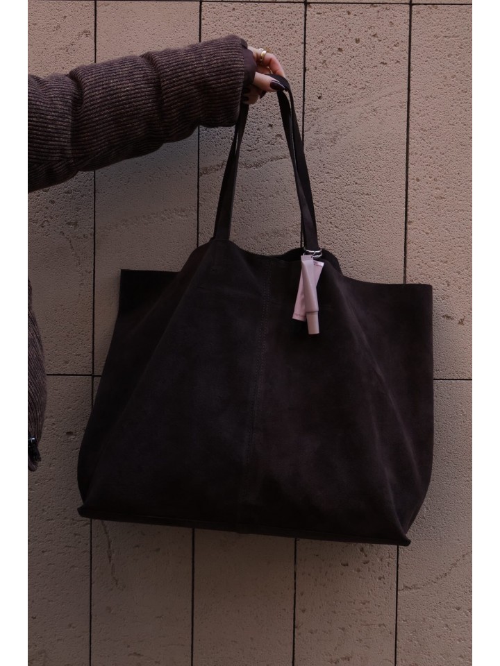 Podkreśl swój styl dzięki tej dużej shopperce z włoskiej skóry zamszowej, stworzonej dla kobiet, które cenią elegancję, wygodę i najwyższą jakość. Miękki, luksusowy zamsz w głębokim, ciemnym odcieniu nadaje torebce wyrafinowany charakter, idealny zarówno na co dzień, jak i do bardziej stylowych, miejskich zestawów.