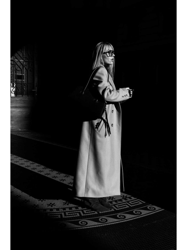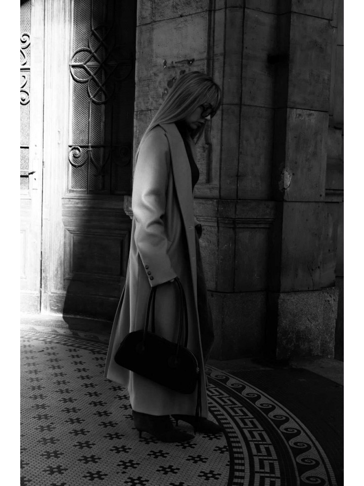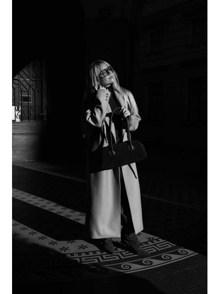 Ta wyjątkowa torebka, wykonana z najwyższej klasy włoskiej zamszowej skóry, to połączenie minimalistycznego designu i wyrafinowanego stylu. Jej elegancki, wydłużony kształt oraz długie, miękkie rączki tworzą formę, która doskonale odnajduje się w nowoczesnej, miejskiej estetyce. Naturalna faktura zamszu podkreśla surową jakość materiału, nadając torebce luksusowy, subtelny charakter.