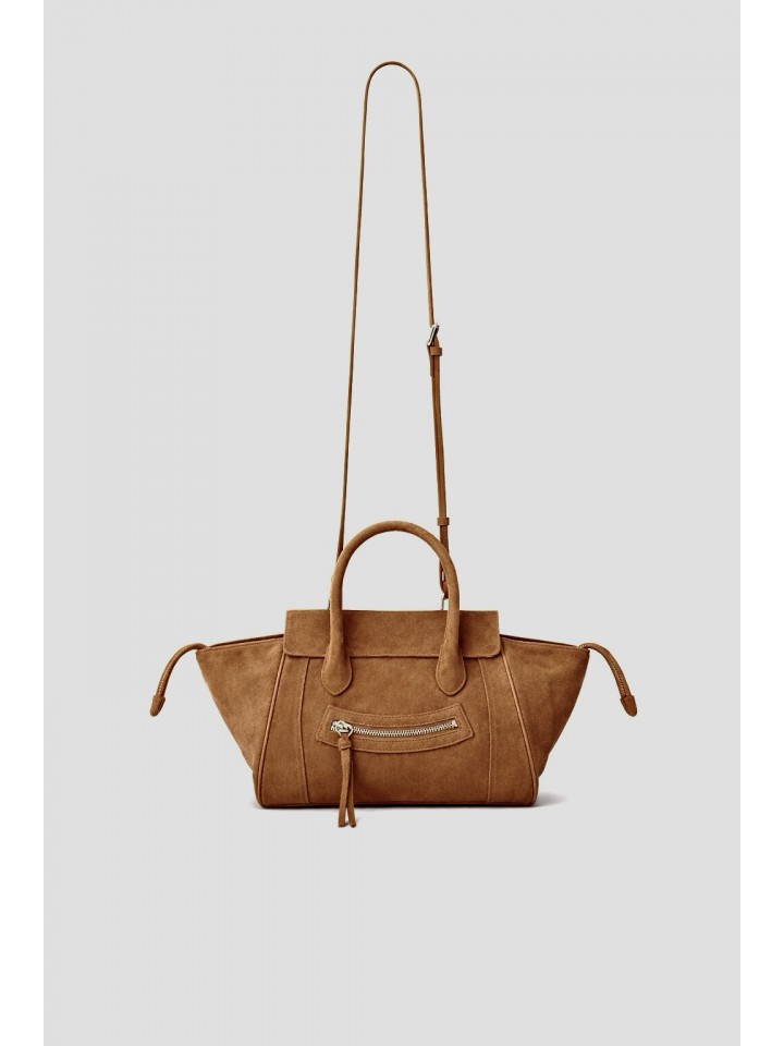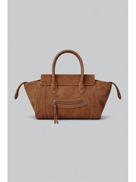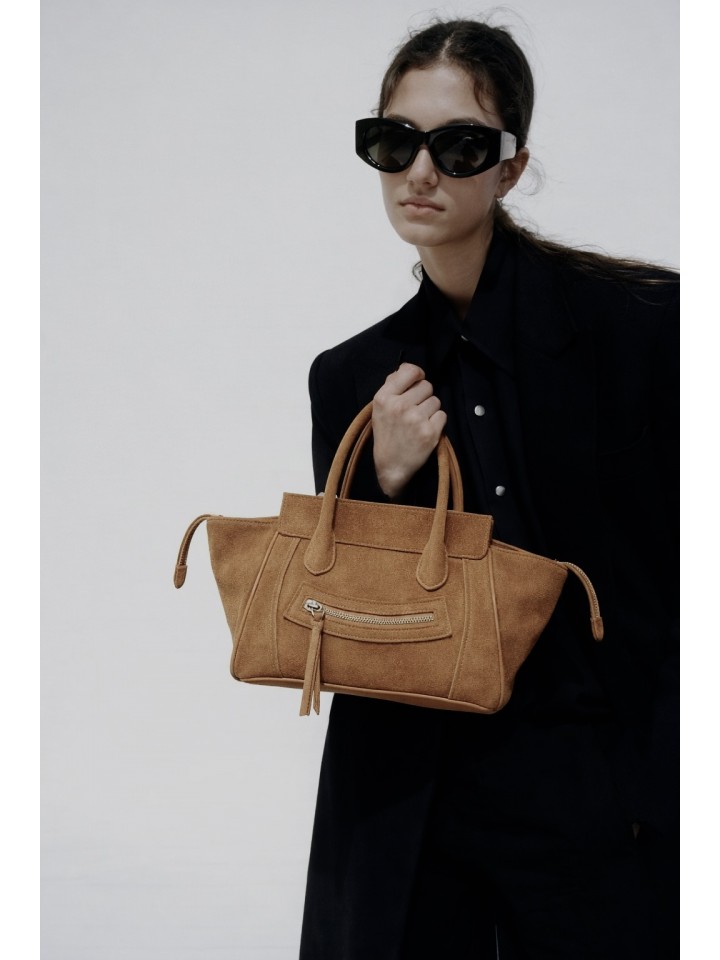 Torebka została wykonana z naturalnej skóry najwyższej jakości. Przód uszyto z miękkiego, szlachetnego zamszu, który nadaje jej głębi i luksusowego charakteru. Tył torebki wykonany jest z gładkiej skóry bydlęcej, co zwiększa trwałość i odporność na codzienne użytkowanie. To przemyślane połączenie estetyki i funkcjonalności, idealne do miejskiego stylu życia.