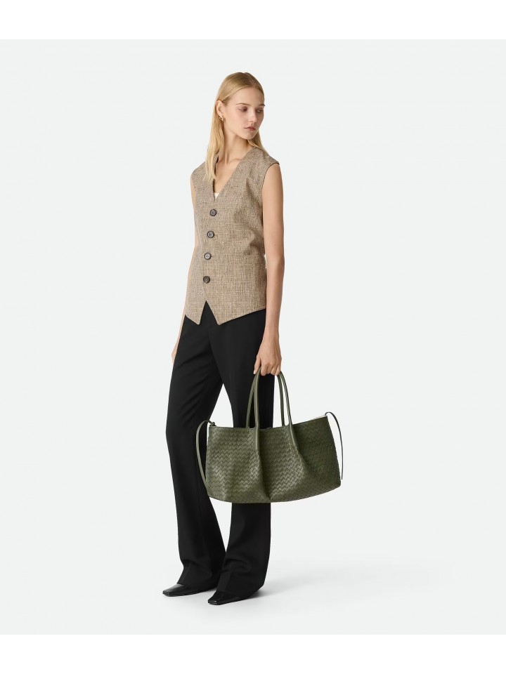 Rivioli to skórzana torebka damska typu tote o plecionej strukturze. Pojemna i proporcjonalna, sprawdza się jako duża torba damska do pracy, miasta i podróży. Miękka konstrukcja i długie rączki zapewniają komfort noszenia, a minimalistyczna forma nadaje jej ponadczasowy charakter. To elegancka torebka ze skóry cielęcej zaprojektowana z myślą o codziennym użytkowaniu — funkcjonalna, wyważona i pozbawiona zbędnych elementów.